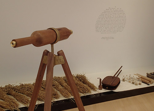 A sculptural interpretation of the Chicago Board of Trade Grain Pit – the oldest operating trading floor for commodities' futures – is the center piece of Open Outcry. Radiating from this octagonal stage were a suite of relational objects illuminating ideas about the history of human civilization, from early technological innovations to cultural evolution, to the environmental stresses of industrial cultivation of grain. Traditionally, the grain pit's raised octagonal shape allowed traders to be seen and heard at optimum levels. In the gallery, the pit was a modular sculpture that comes apart to host various events and gatherings; a threshing party, performances, artist talks, and a symposium. Through the physical transformation of the pit, people can re-define and occupy this space that is usually locked up behind the doors of the Chicago Board of Trade.
