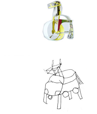 This and other questions were posed by This is Not a Trojan Horse, a large, human-powered, wooden horse designed by Futurefarmers with architect Lode Vranken. Built at Pollinaria in Abruzzo, Italy, the project emerged as a vehicle for social and material exchange at a pivotal moment in this region. Context: A few decades ago wild horses roamed free in Abruzzo and agriculture was a thriving and predominant occupation. Now big box stores, parking lots and gas stations are quickly taking place of pastures and cultivated land, while modern-day agricultural standards threaten the nuances of traditional production. Nearby cities lure the young, leaving the aging farming population without a generational change of guard. The region gained a momentary spotlight on the world stage during the earthquake of L’Aquila in 2009 and shortly thereafter the G8 summit, undergoing important changes within a very short time. Abruzzo becomes the pasture where This is Not a Trojan Horse wanders freely on a 10-day tour collecting traces of rural practices; seeds, tools and products to enliven the imaginations of farmers through discourse, artistic production and to parade their truths to power. The idea of the Trojan Horse becomes a significant modus operandi for contemporary society, beyond the symbol embedded in the historical-mythical event. Upon return to Pollinaria collected seeds will be planted to symbolize the collective memory of the tour and to celebrate local biodiversity. .................................................................................. Form: Normally we make architecture and space by defining the borders, walls, floors ... Borders define a space in which we organize social interaction. Mostly we create a physical exterior for a social interior happening; Rooms, spaces... A static structure that has an emptiness inside for possible programmed human interaction. The Trojan Horse had such interior in its belly. But that belly was a place for soldiers. This is not a Trojan Horse turns all of this inside out. The horse is not a symbol of war, but rather community. The inside is a place for gathering. It’s a sphere where the “in between” between people becomes the center rather than the individual. The moment people come together there is a “with” that makes them community, one united subject. The architectural space becomes being together. This architectural construction has no inside. This in not a building that defines social space inside borders. This is Not Trojan Horse is a centre instead of a border. The social space is formed around the object as a concentric circle without borders. It becomes a physical space with moving edges. The architecture loses its physical function as defining the edges of social space as it folds inside out. This is Not Trojan Horse is moving. It is not a center, but a nomadic physical structure in a physical network, moving around in this rural area, creating a new physical network. By its moving, the Horse makes the social meeting place it was before into a social rhizome. The architectural space now exceeds its own construction and becomes virtual possibilities for new social interaction. Local tradition becomes global renewal. The physical structure looses its' dimension and start to form a scaleless physical space. This is not a Trojan Horse is a sort of architecture that through the constructive and physical new social possibilities emerge– a new form of rhizomatic thinking about architecture where the body disappears in a nomadic social group subject. The structure gives reason to the creation of new social and political “concepts” in the Abruzzo region and further, … on the net, in the minds of the people it meets… It becomes new thinking, a resistance to the traditional discourse...bio politics. Various forms of power merge within the design of This is Not a Trojan Horse: human power, bike power, and animal power. While the horse wanders around, it stops in places, villages and farms where it leaves its memories and common ideas behind while gathering them simultaneously. The horses’ "skin" is covered with chalkboards to document perspectives contributed by locals about the future of farming and to record relevant news. The horse becomes a roaming newspaper where the news comes directly, unedited, unmediated from the authors who speak it-– from the horse’s mouth. .................................................................................. * The main source of inspiration for this work is Epios: A Sculptor by Cooley Windsor written in 2008. Windsor tells the story of the Trojan Horse through the architect appointed by Agamemnon. ..................................................................................