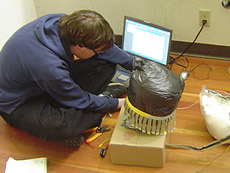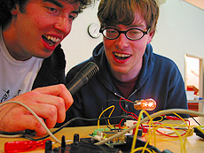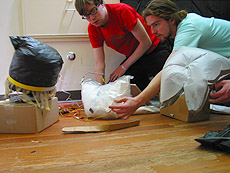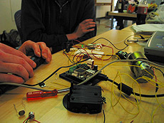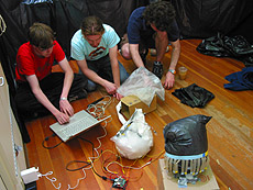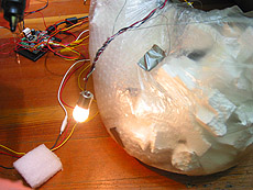 | Project Name: Bags of North America Audience: Students User Experience: Audience will experience bag behavior, and may or may not be able to modify or emulate their behavior. By shouting and yelling the audience triggers the heightened emotional state of the bags via volume and brightness control. When our bag creatures hear shouts their lights and spins become more frantic emulating the state of any other creature. Tech specs : Max MSP, Teleos, photo sensor, microphone, accelerometer, motors, grocery bags, Tech Challenge: Developing a convincing multi sensory and recursivly sustained communication system. Photos/Drawings: Bag creatures with appendages interacting with each other as well as user input. Social Aspect of project: Awareness of the consequences, for better or worse, on other communities 'way of life'. |
