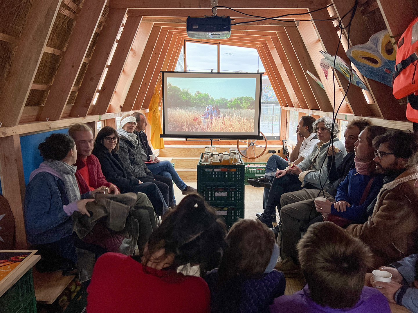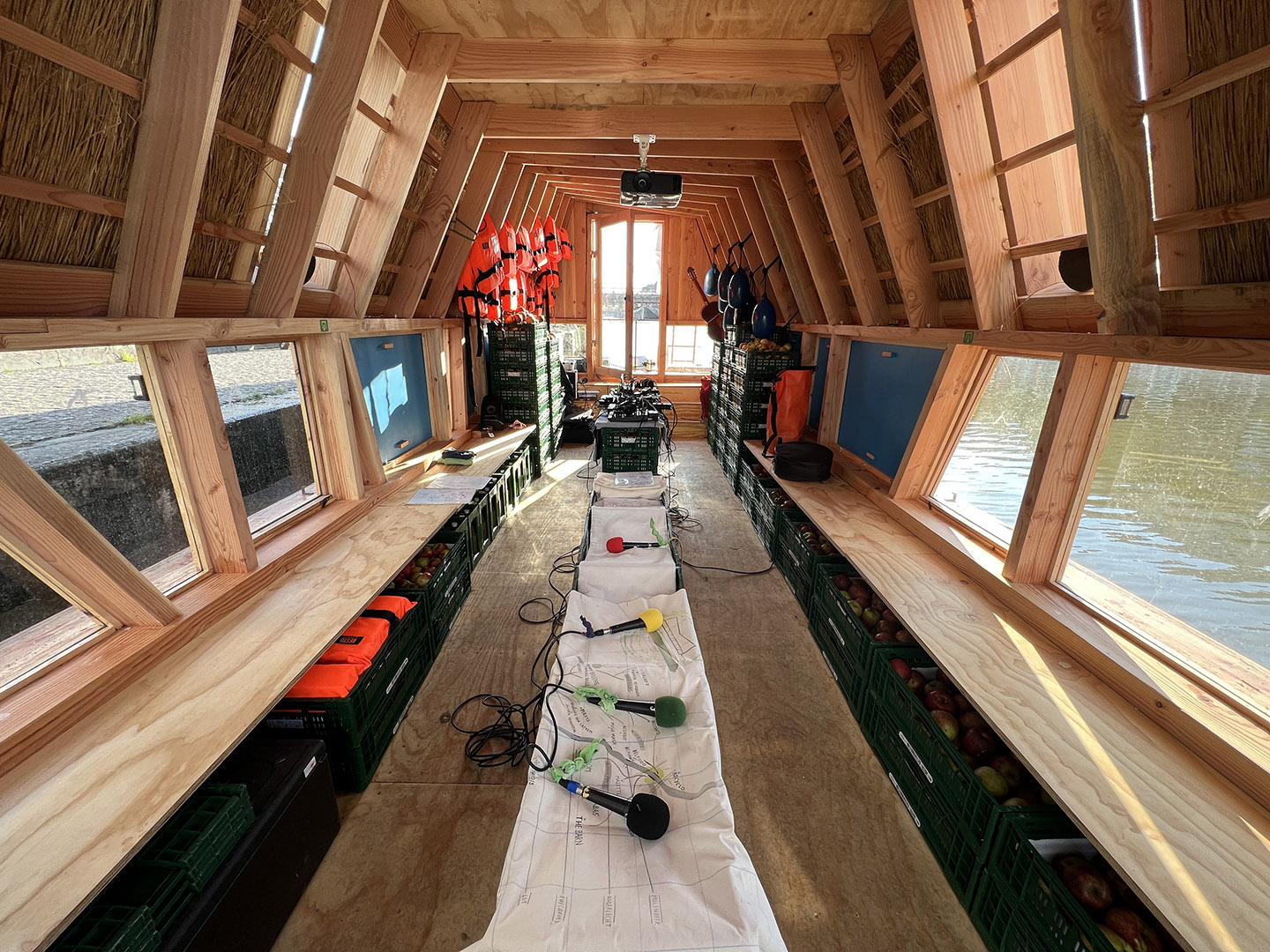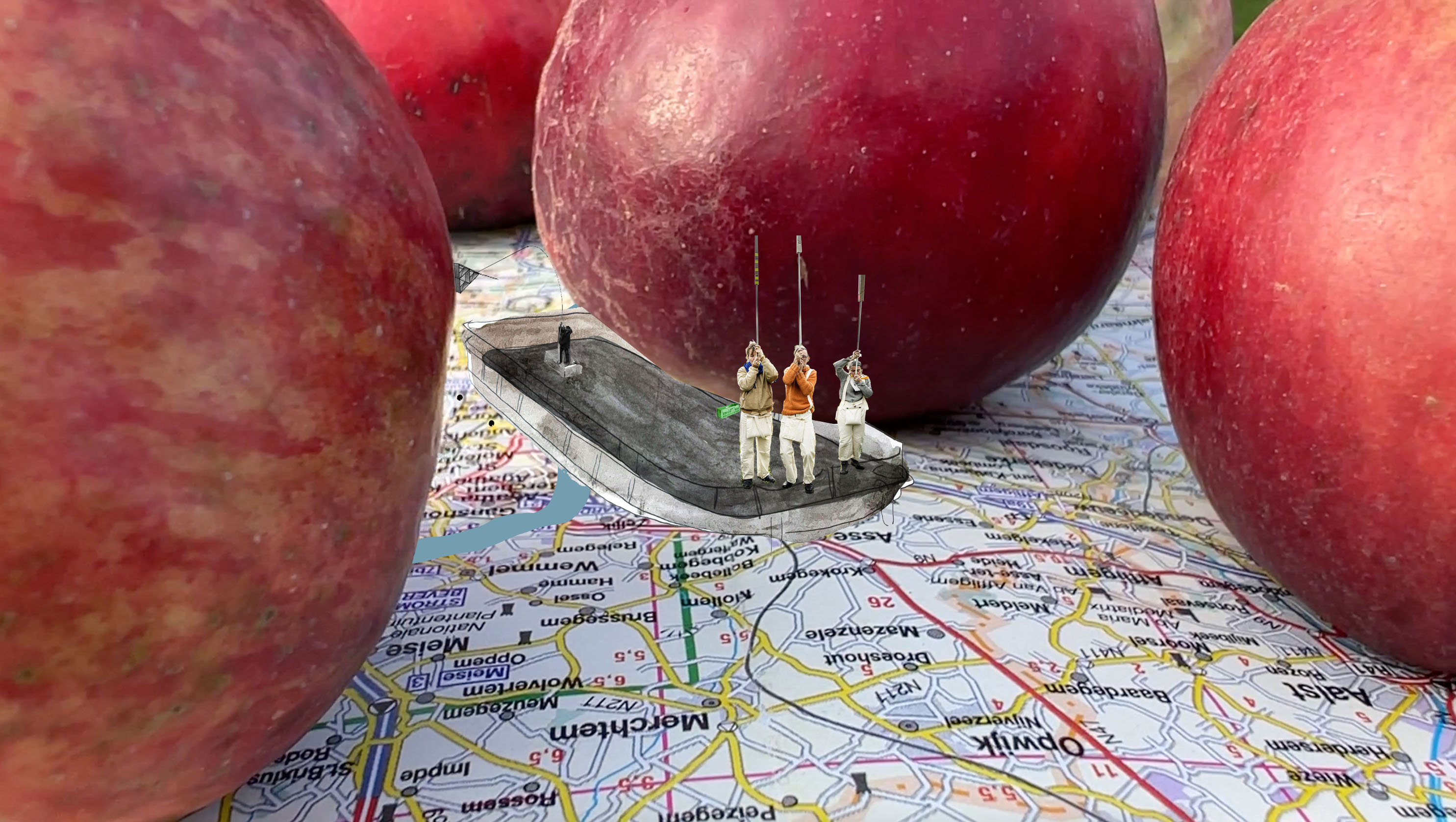 A Movement from the country into the Belly..., a wooden canal boat is a call to action to reconsider our food systems and the interdependencies that shape them. Functioning as a new agri-cultural platform, In the Belly.. supports food transport and cultural production by moving food into the belly of the European Capital city of Brussels using the existing infrastructure of the Brussels-Charleroi canal. In the Belly... redefines transportation logistics from trucks to boat to bike; gathering food from farmers, bundling, sorting and packing on the boat and parading through the city by bike onto the shelves of cooperative stores and into collective kitchens and further into the bellys... In the Belly... was commissioned by GLUON in partnership with Innoviris, Good Food Brussels, VUB, EIT Food, and UGhent. This project has received funding from Innoviris, the National Lottery and S+T+ARTS (Science, Technology & the Arts), an initiative of the European Commission, launched under the Horizon 2020 research and innovation program.