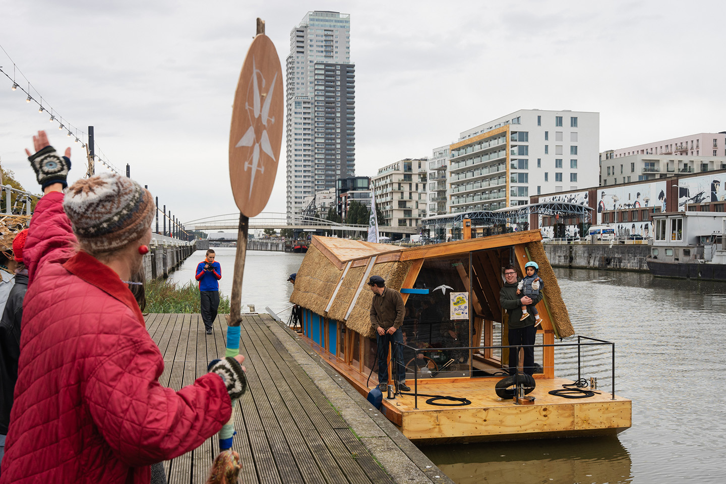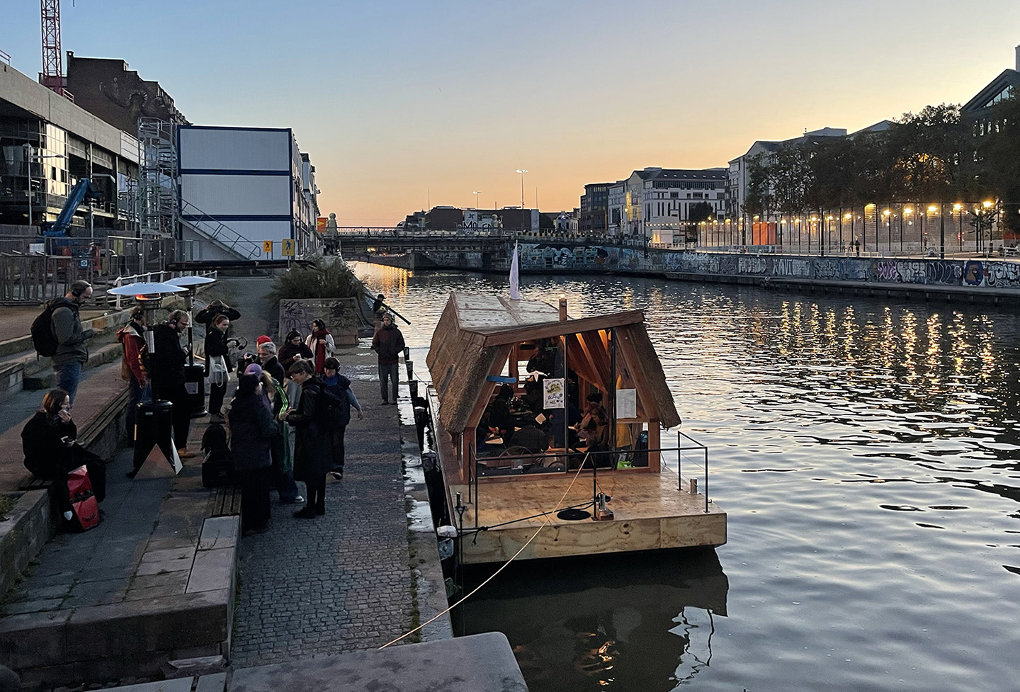A Movement from the country into the Belly..., a wooden canal boat is a call to action to reconsider our food systems and the interdependencies that shape them. Functioning as a new agri-cultural platform, In the Belly.. supports food transport and cultural production by moving food into the belly of the European Capital city of Brussels using the existing infrastructure of the Brussels-Charleroi canal. In the Belly... redefines transportation logistics from trucks to boat to bike; gathering food from farmers, bundling, sorting and packing on the boat and parading through the city by bike onto the shelves of cooperative... more >