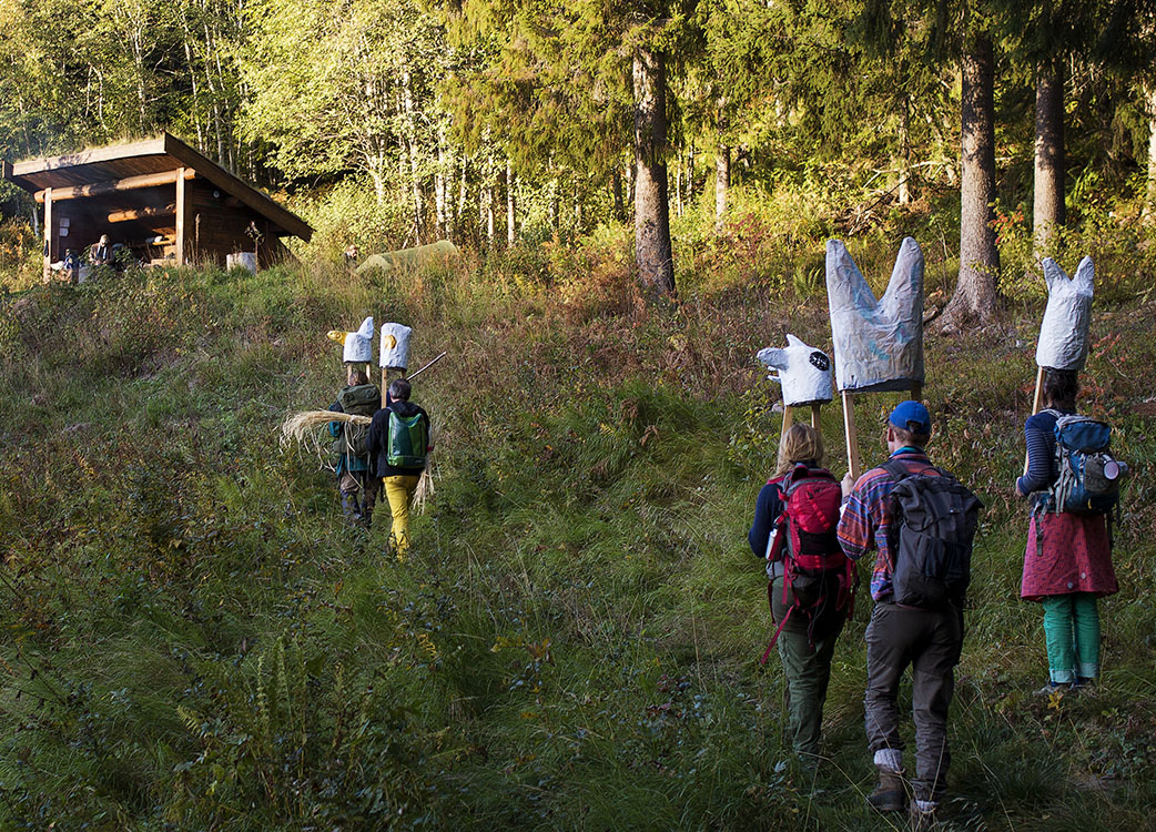 A five-day walk over land, masked bodies moved from the city of Oslo through forests (and de-forested zones), meeting farmers, exercising the commons, sleeping in cabins, barns and open fields. Strange signals, utterings and voicings emerged from within the Flatbread Society Bakehouse. These frequencies entranced the ensemble of migratory bodies to carry seeds, bread and provisions from the city to the the farm of Johan and Kristin Sward. This action marked the culmination of an eight-year project in Oslo - Flatbread Society. With resident baker, beekeeper, chef and activists, Flatbread Society is dispersed further on...... more >
