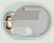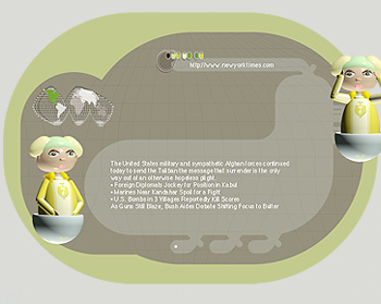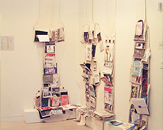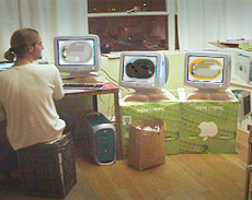 Photos counterclockwise starting from top left [above]: 1.North America browser streaming live newsfeed from New York Times. 2. Sorth America browser streaming live newsfeed from South America Daily. 3. Sascha Merg Installation/Sasacha and Joern networking 7 monitors between 2 computers. 4. Europe browser with collective text bubble passing by. The text in the bubble is a made up of remote contributions via Nutrishnia.org webste. 5. Zine Wall by James Harbison. Zines were displayed on hanging canvas rolls (floor to ceiling) with pockets made from suit lining.