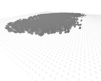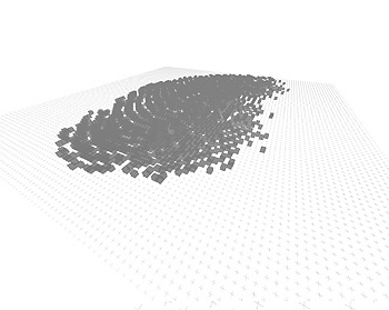 An installation that lets one wander through a 3D labyrinth made from one's own scanned fingerprint. The fingerprint scanner uses a prism, a macro photographic lens, and a webcam to capture live video of one's print. A Processing application (with some custom Java bits), running in presentation mode, captures live video from the scanner and saves a convolved image to another computer running the Fingerprint Maze game. An OS X application, written in C++ and OpenGL, picks up fingerprint files and renders them in 3D. For each dark pixel it finds in the image, it places a translucent cube in virtual space. The labyrinth can be navigated from above, or explored at ground level. What we made is something between copy machine art and generative architecture. photos: top view of scanned fingerprint. |