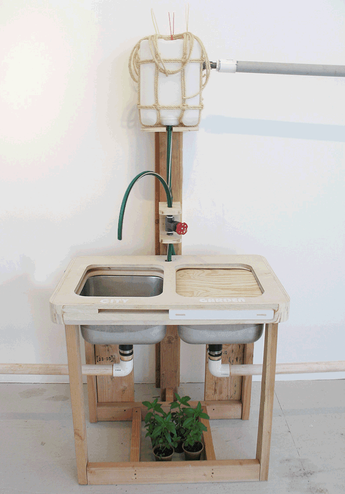 Rainwater Harvester / Greywater System Feedback loop is a water saving system made from salvaged materials. It stores two types of water–water that normally runs away while becoming hot and rain water. The water is stored in the 3 small recycling bins which can also be used as benches to sit upon.