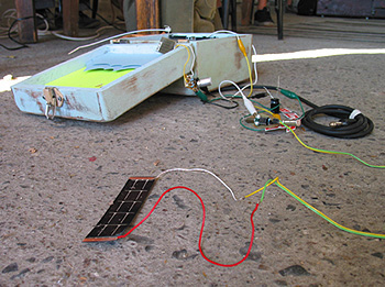 Solar Music Boxes [SMB] are music boxes powered by the sun. Energy is harvested from the sun via solar panels which power a motor, which is connected to the gears of an analog music box. The boxes are wired such that they can be amplified. Solar Music Boxes can exist inside or outside. Inside: Solar Music boxes can triggered by flash lights to create a light orchestra. Sound can be processed or simply orchestrated by flash light interaction. Outdoor/Public Installation. Solar Music boxes can act as an accumulative sound clock. SMB are distributed under a trees shadow such that as the shadow moves over the course of the day each music is revealed allowing the sun to feed it and let it sing out. A new box adds to the orchestra each hour. The music boxes will play when sunlight is revealed upon them- a sonic sundial. |
